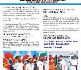 The Nigeria Air Force college of Nursing Sciences (NAFCONS) is inviting Applications from suitably qualified candidates for admission into ND and HND Programmes of the College for the academic session of 2023/2024.