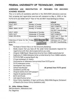 Candidates who chose Federal University of Technology, Owerri as First Choice University in the 2023 Unified Tertiary Matriculation Examination (UTME) and Direct Entry (DE) are hereby invited to the Screening Exercise for admissions.