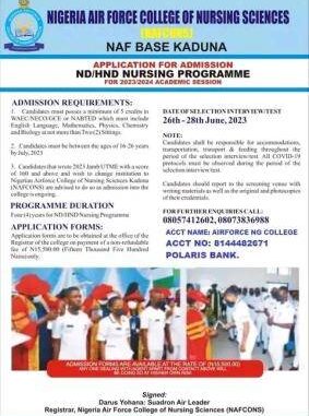 The Nigeria Air Force college of Nursing Sciences (NAFCONS) is inviting Applications from suitably qualified candidates for admission into ND and HND Programmes of the College for the academic session of 2023/2024.