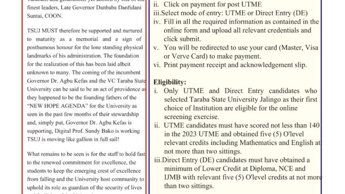 i. Only UTME and DIRECT Entry candidates who selected Taraba State University Jalingo as their first choice institution are eligible for the online screening exercise.