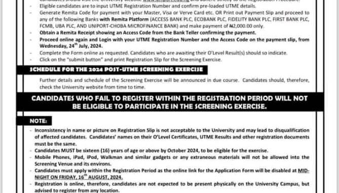 – Registration is online, therefore candidates are not expected to be present physically on the University Campus but advised to register from any location.