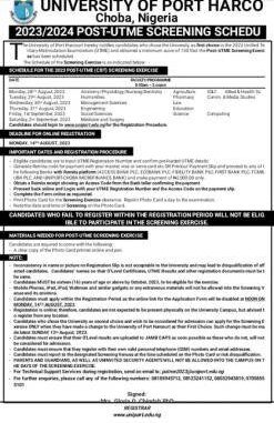 The University of Port Harcourt hereby invites candidates who chose the University as First Choice in the 2023 Unified Tertiary Matriculation Examination (UTME) and obtained a minimum score of 150, to apply for Post-UTME Screening Exercise for admission into the University.